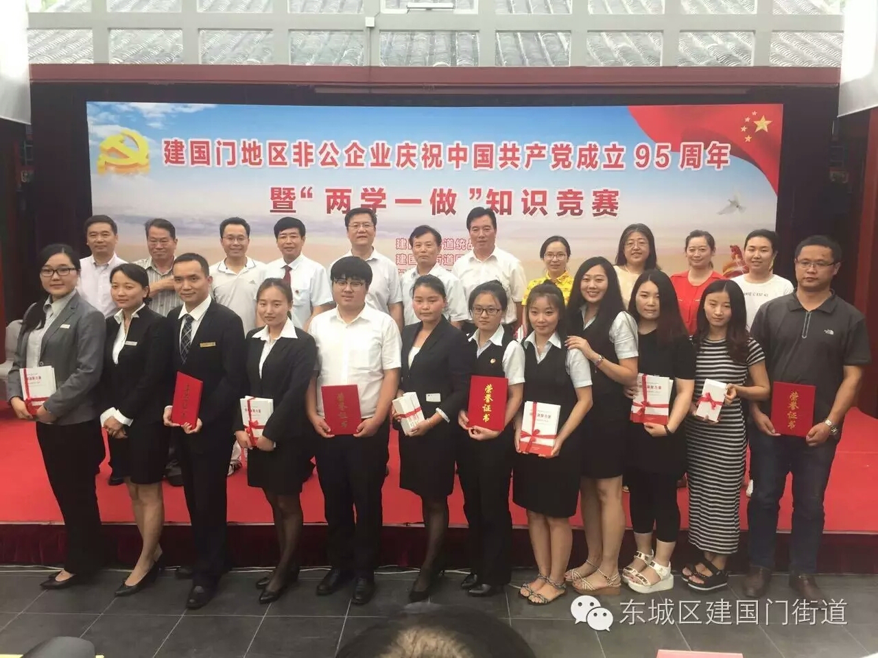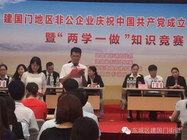 2016年 7月22日,建国门街道统战部、建国门街道团工委、建国门街道商务楼宇服务站、建国门街道商会共同举办了建国门地区非公企业庆祝中国共产党成立95周年暨“两学一做”知识竞赛。东城团区委副书记关丽丽、团中央国际部一处副处长李小慧、建国门街道工委副书记徐阳及区工商联相关领导参加。
