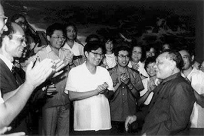 1987年,邓小平亲切会见中青年科技人才。