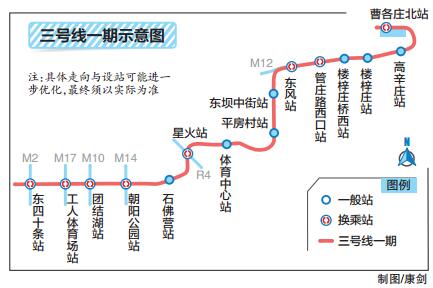 率先开建的3号线一期西段长约14公里、9站自西向东分别为东四十条站、工人体育场站、团结湖站、朝阳公园站、石佛营站、星火站、体育中心站、平房村站、东坝中街站。