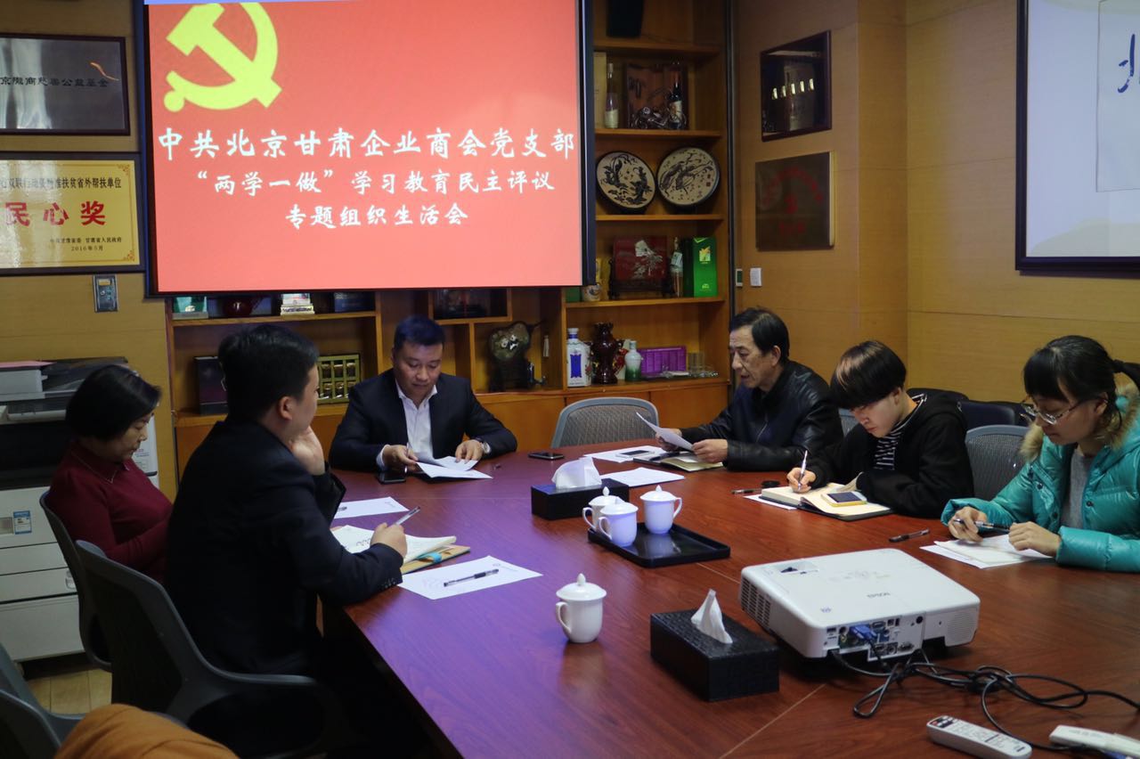 2017年3月8日,中共北京甘肃企业商会党支部关于“两学一做”学习教育专题组织生活会和民主评议党员大会在商会办公室召开。党支部书记罗刚、副书记李志敏、组织委员王西铭、党员史均婕参加。党员翟彦虎、杨建华、袁国辉、汪玲、汪建强请假。书记罗刚主持会议。部分积极分子参加了传达上级文件精神环节。