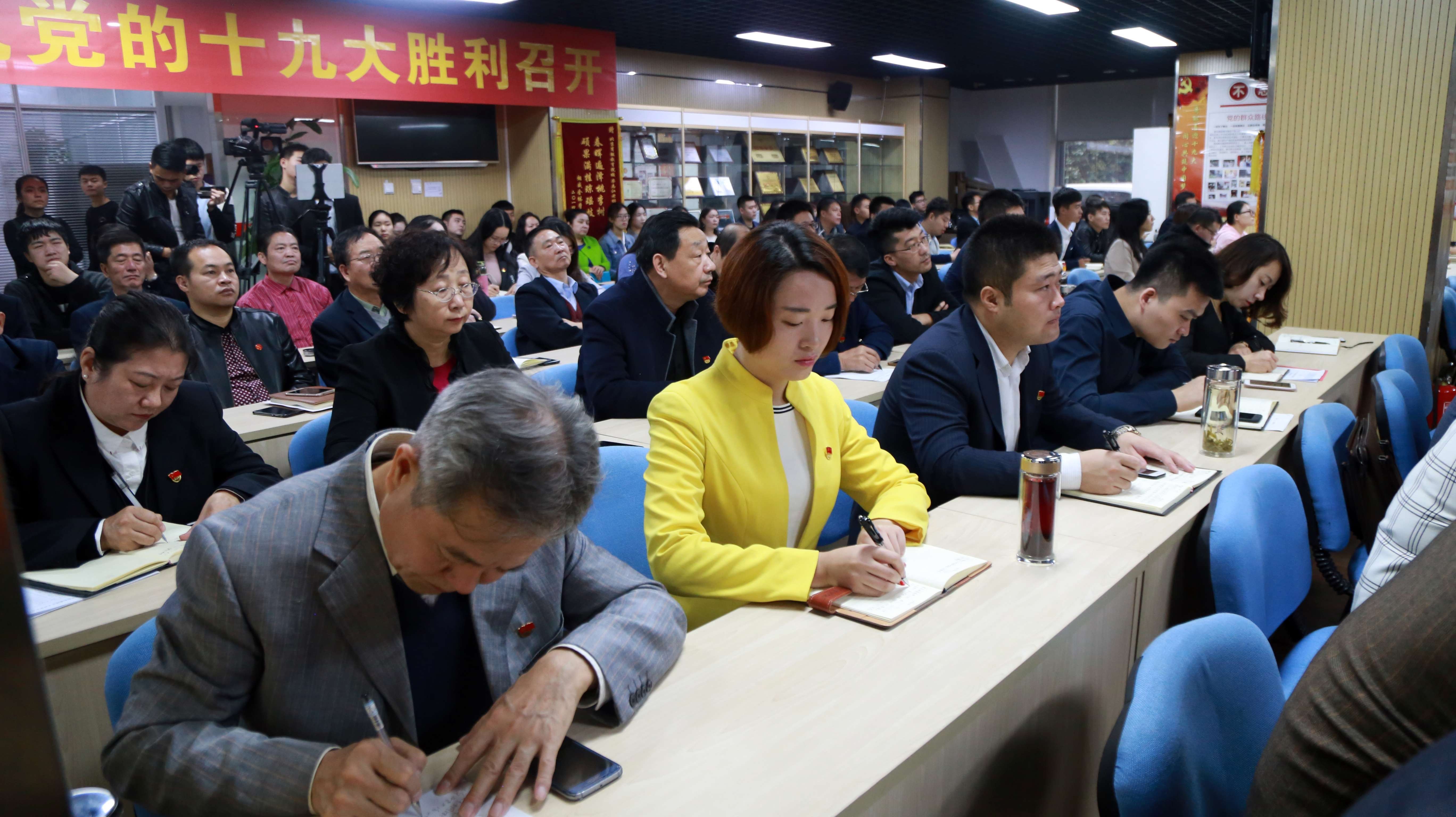 接着,全体人员在现场,随着隆重庄严的十九大会场的议程,一起唱国歌,一起为革命先烈默哀。在习近平总书记的报告过程,大家不时发出热烈的鼓掌声,深深被习近平总书记报告中的精彩段落所打动,为我们党所取得的举世瞩目的伟大成就所振奋,为报告描绘的新的壮观蓝图所吸引。整个收看过程严肃认真,秩序井然,大家认真做着笔记,记下这一隆重时刻习近平总书记向世界发出的新的最强音,更是把这一难以忘怀的历史性画面牢牢记在了心里。