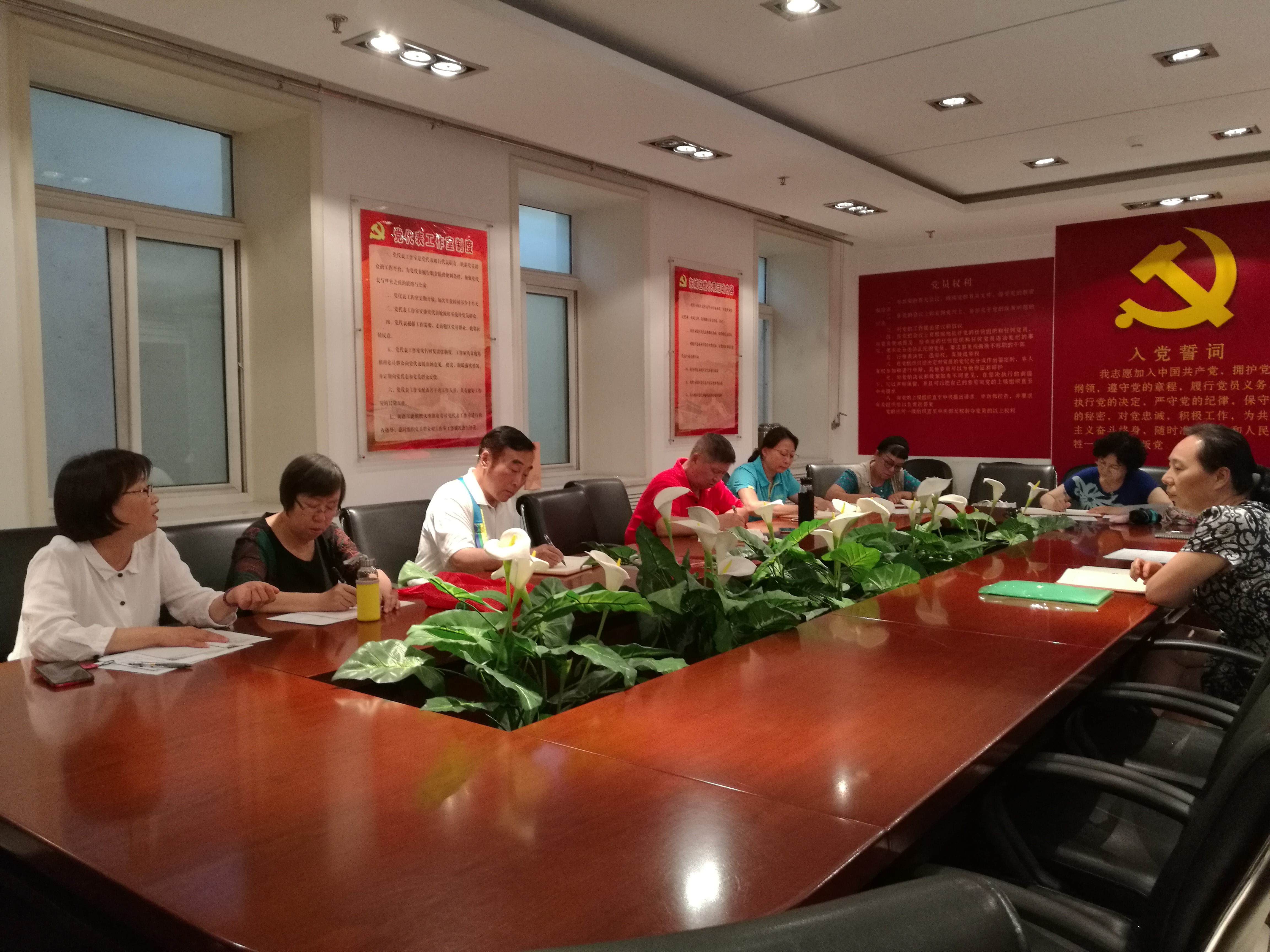 2018年6月14日上午9点,在东花市街道党服中心会议室,东花市街道8名非公退休党建指导员关于如何更好的为企业服务和走访企业进行交流和学习。