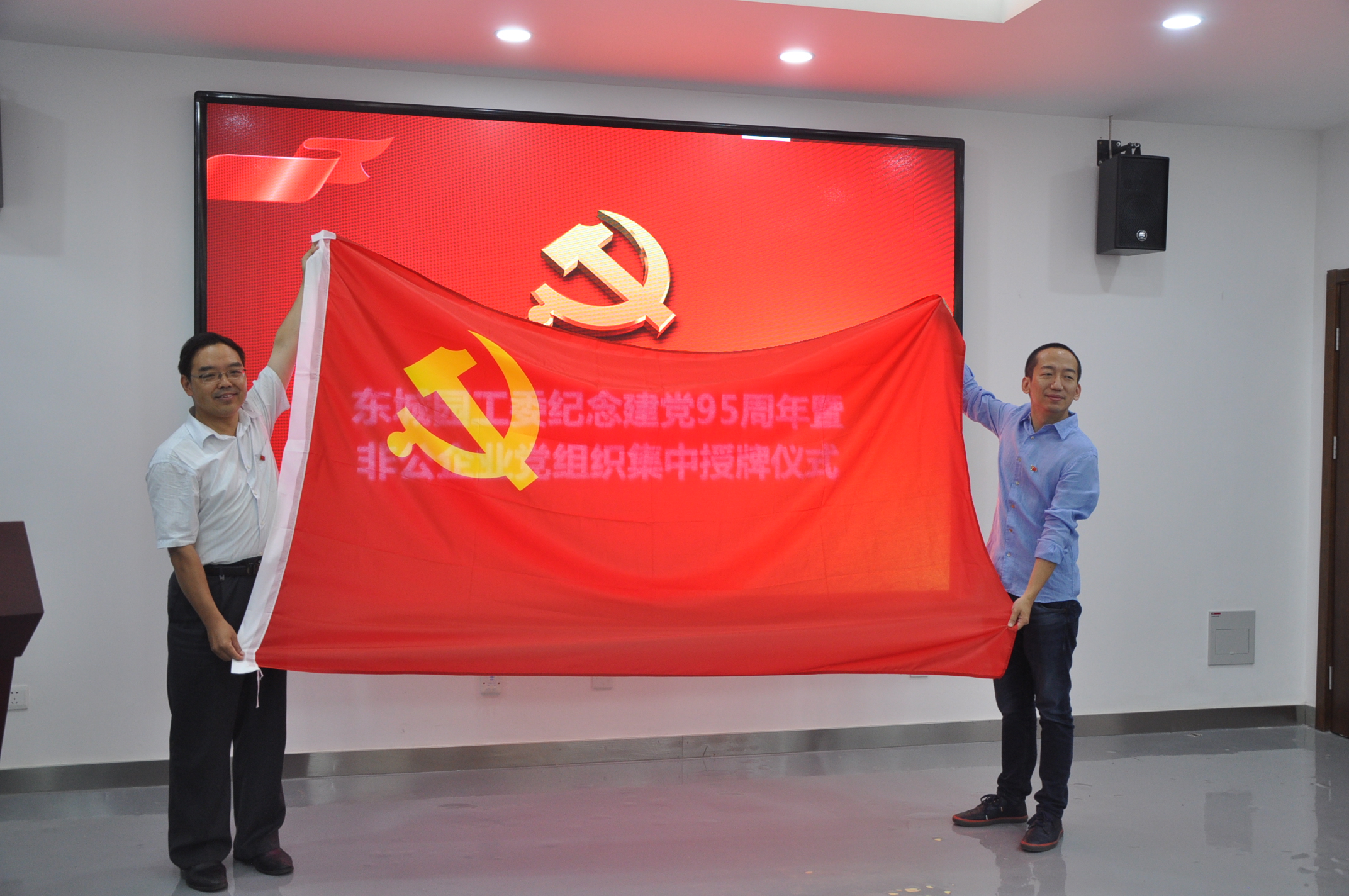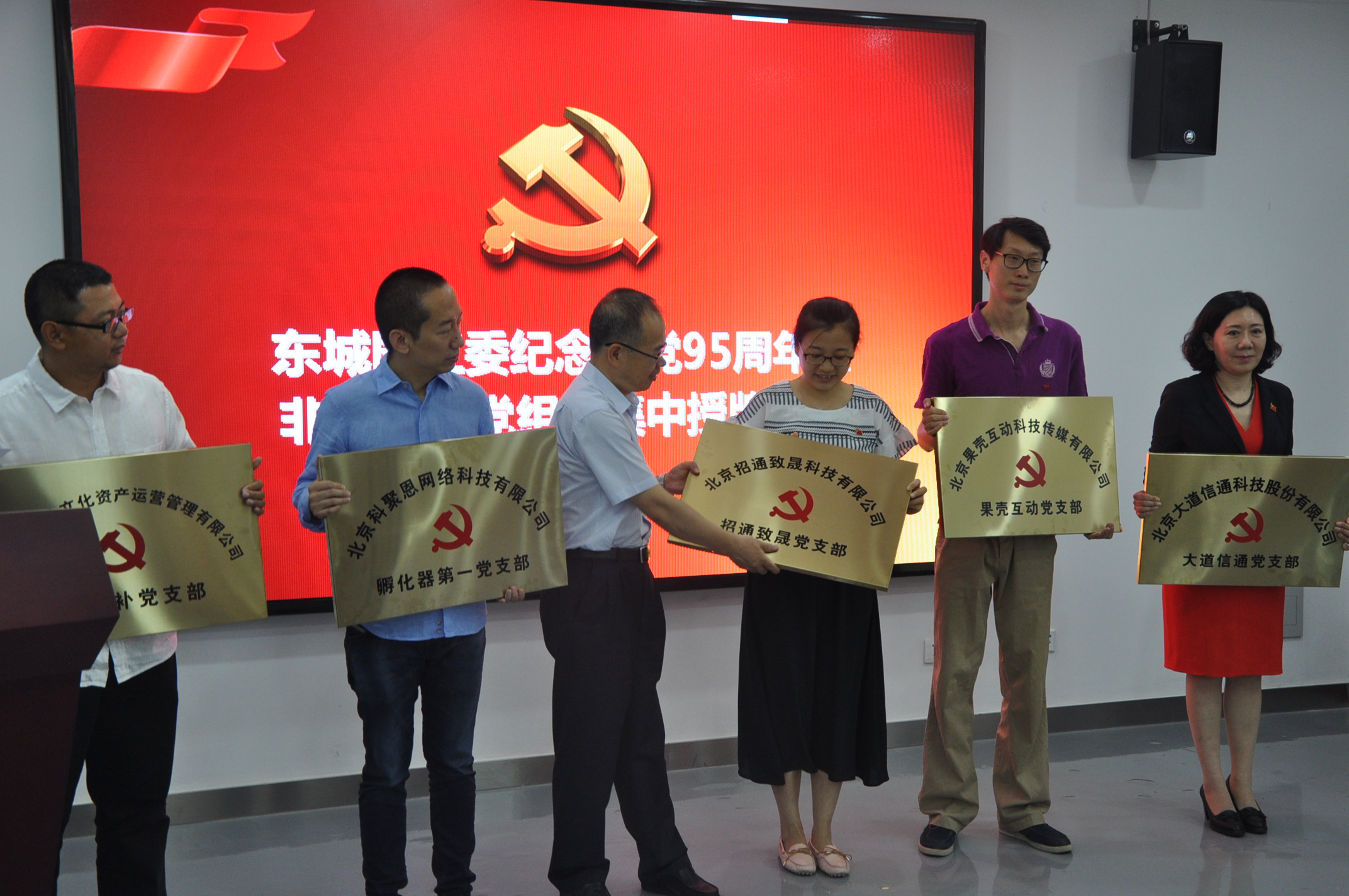 6月24日上午,东城园工委举办纪念建党95周年暨非公企业党组织集中授牌仪式,区委常委汤钦飞、非公企业党支部书记及党员代表共50人出席活动。